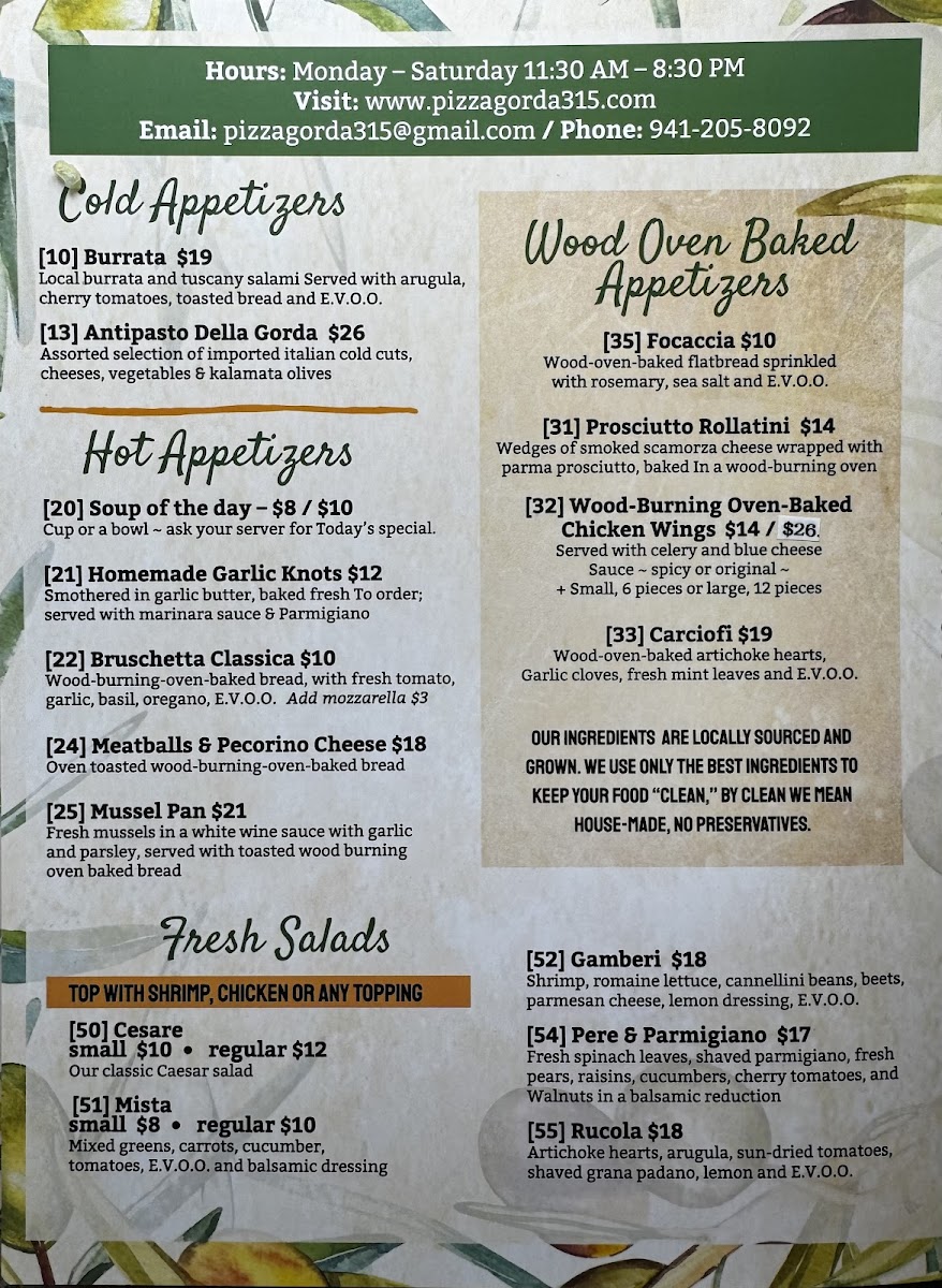 Welcome to Pizza Gorda, an authentic Italian gem nestled in the heart of Punta Gorda, Florida, at 315 Taylor St. This family-owned restaurant captures the essence of Italy through its delightful menu, featuring a variety of pizzas baked to perfection in a traditional wood oven. Each dish showcases fresh ingredients that elevate your dining experience.